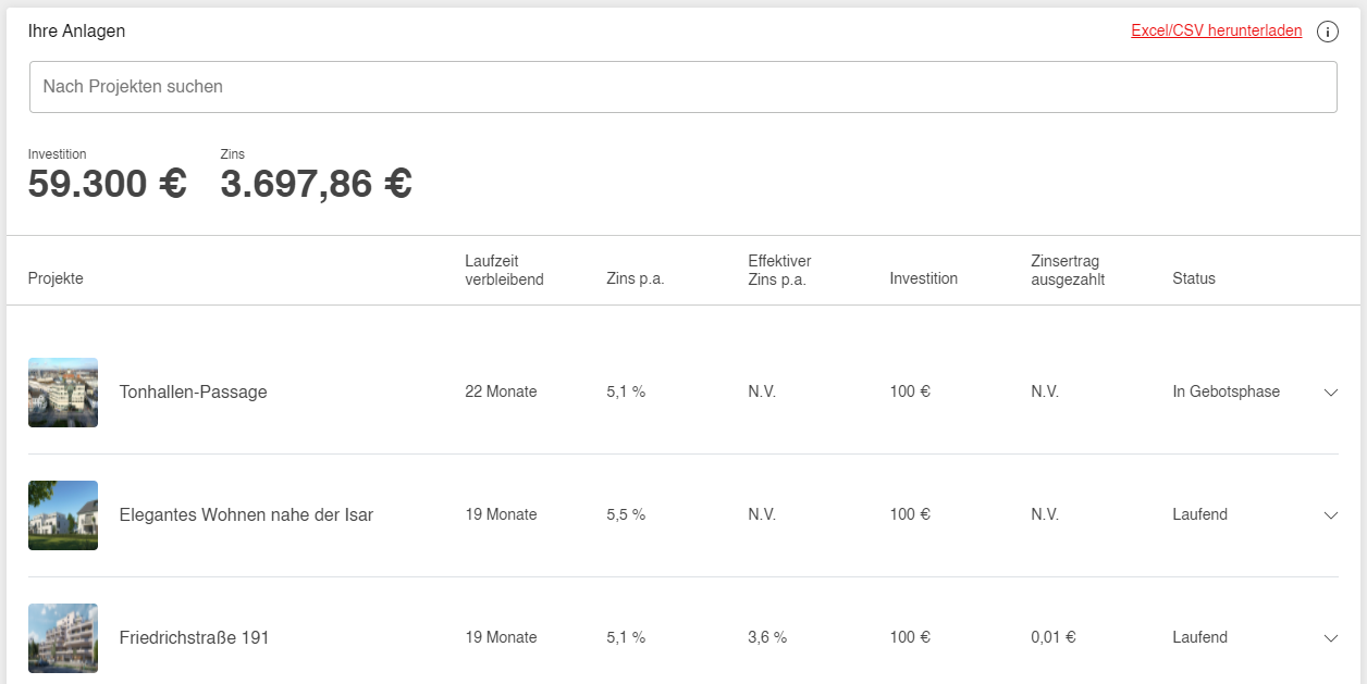 Wichtig: Investitionen in Projekte, die sich in der Gebotsphase bzw. innerhalb der Widerrufsfrist befinden, werden in einigen Ansichten (insbesondere zu Zahlungsströmen) noch nicht berücksichtigt. Die Verzinsung Ihres Kapitals startet jedoch nicht erst ab der Auszahlung an den Projektentwickler, sondern bereits an dem Tag des Geldeingangs auf dem Treuhänderkonto!