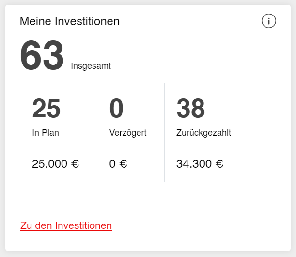 Darüber hinaus sehen Sie neben dem gebundenen Kapital auch den aktuell erreichten Effektivzins Ihrer Anlagen. Dieser spiegelt die real erzielten Erträge Ihrer Anlagen zum aktuellen Zeitpunkt exakt wieder. Mehr zum Thema Effektivzins finden Sie in unseren FAQ.