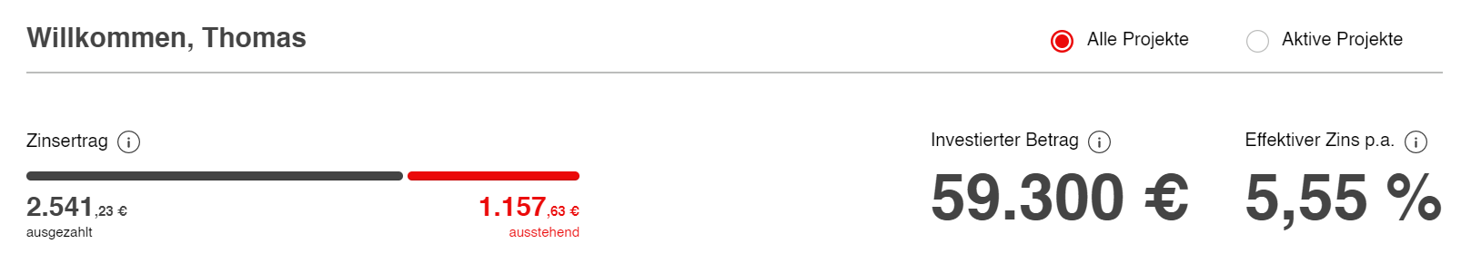 Als Erstes erhalten Sie einen Überblick über Ihr eingesetztes Kapital sowie die ausstehenden und bereits erhaltenen Zinserträge. Dabei können Sie für das gesamte Dashboard zwischen zwei Ansichten wählen: Sollen nur aktuell laufende Investitionen dargestellt werden oder sollen, für eine historische Betrachtung, auch bereits abgeschlossene Anlagen gezeigt werden?