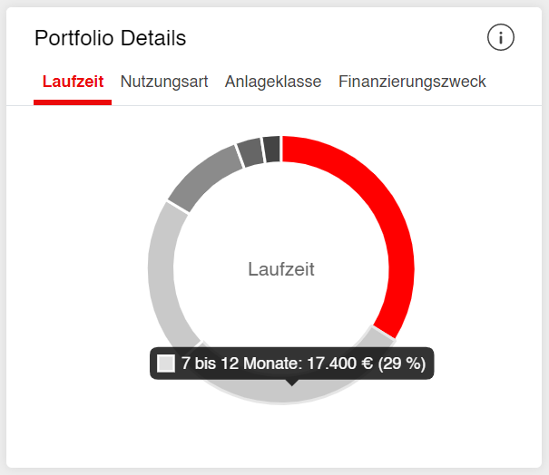 Vermeiden Sie Klumpenrisiken und streuen Sie Ihr Kapital möglichst breit. Als Unterstützung sehen Sie eine grafische Zusammenfassung Ihrer Investitionen nach ursprünglich vereinbarter Laufzeit, Nutzungsart der Immobilie, Anlageklasse und Finanzierungszweck in einem interaktiven Kuchendiagramm.